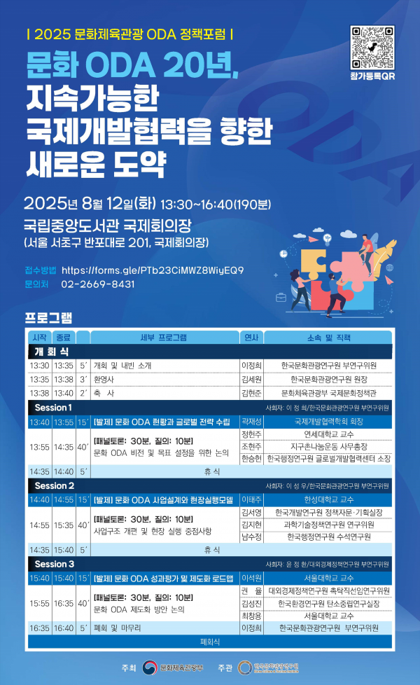 [아시아월드뉴스] 문화체육관광부는 한국문화관광연구원과 함께 8월 12일 오후, 국립중앙도서관에서 문화 공적개발원조 20주년을 맞이해 ‘지속 가능한 국제개발협력을 향한 새로운 도약’을 주제로 ‘2025 문화·체육·관광 공적개발원조 정책 포럼’을 개최한다.