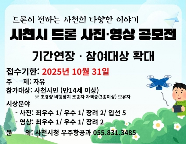 박동식 시장은 “참여 기회가 넓어진 만큼 청소년을 비롯한 많은 시민들이 드론을 통해 사천의 새로운 매력을 발견해주길 기대한다.