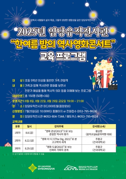 2025년 임당유적전시관“한여름 밤의 역사영화 콘서트”는 무더운 여름밤 임당유적전시관 중앙로비에서 가족들이 모여 전문가의 해설을 들으며 편안하게 역사영화를 즐기는 프로그램이다.