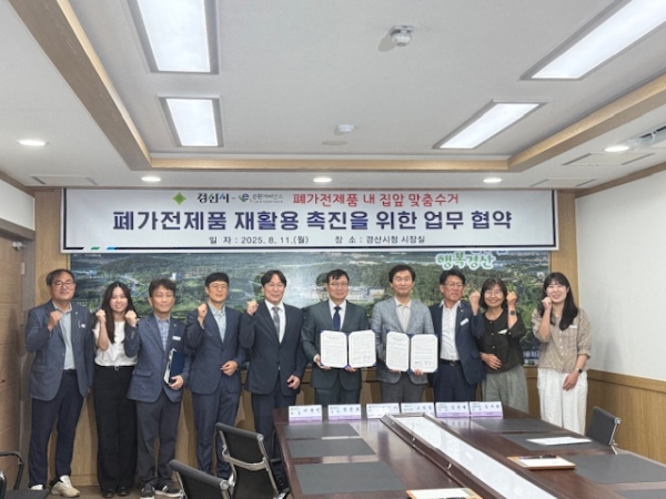 [아시아월드뉴스] 경산시는 한국전자제품자원순환공제조합 E-순환거버넌스와 중소형 폐가전 내 집 앞 맞춤 수거 서비스를 위해 “폐가전제품 재활용 촉진을 위한 업무협약”을 11일 체결했다.