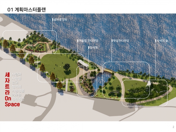이번에 선정된 세자트라 온스페이스 조성사업은 용남면 화삼리 216번지 일원 9,700㎡ 부지에 △무장애 산책로 및 전망공간 △어울림 마당 △사색의 숲 △사계절 정원을 조성해, 방문객에게 바다를 조망하며 휴식과 사색을 즐길 수 있는 자연친화적인 열린 공간을 제공하고자 한다.