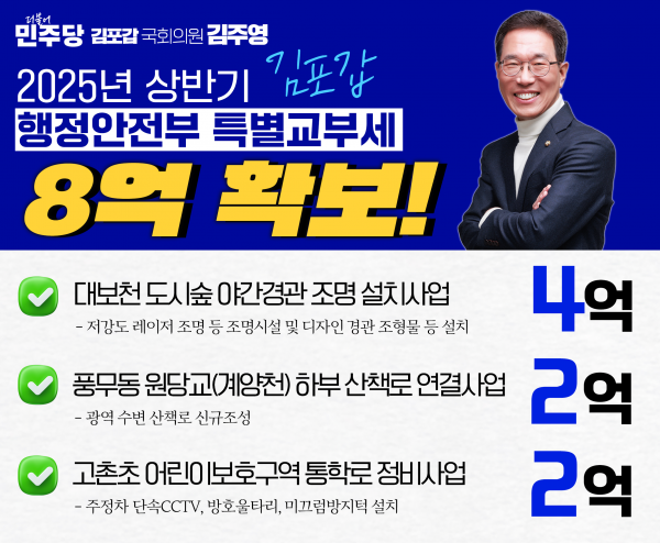 [아시아월드뉴스] 국회 환경노동위원회 간사 김주영 의원이 김포시민의 삶의 질 향상을 위한 풍무동 원당교 하부 산책로 연결사업 등 2025년도 상반기 행정안전부 특별교부세 8억원을 확보했다고 14일 밝혔다.