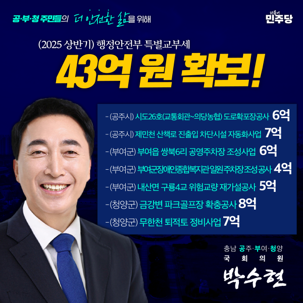 [아시아월드뉴스] 더불어민주당 박수현 국회의원은 행정안전부로부터 공주·부여·청양 지역 현안 해결을 위한 특별교부세 ‘총 43억원’을 확보했다고 14일 밝혔다.