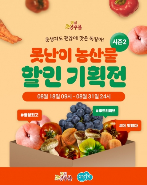 [아시아월드뉴스] 상주시는 명실상주몰에서 8월 18일부터 31일까지 14일간 못난이 농특산물 기획전Ⅱ를 진행한다 이번 기획전은 6월에 이어 2차로 개최하는 못난이 농특산물 기획전으로 겉모양은 못생겨도 맛과 품질은 그대로인 저품위 농특산품을 저렴하게 구매할 수 있도록 마련 됐으며 제철과일 복숭아, 토마토를 비롯해 꿀, 버섯, 감말랭이, 곶감 크림치즈 호두말이, 감식초 등 다양한 상품을 20~30% 할인된 가격에 만나볼 수 있다.
