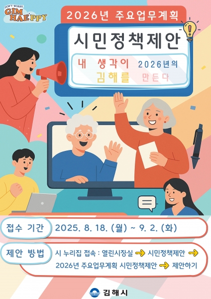 ‘내 생각이 2026년의 김해를 만든다’란 주제 아래 8월 18일부터 9월 2일까지 김해시민 누구나 내년도에 희망하는 사업들을 분야별로 제안할 수 있다.