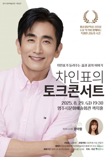 [아시아월드뉴스] 영주시문화예술회관은 오는 8월 29일 오후 7시 30분 까치홀에서 2025 기획공연 ‘차인표의 토크 콘서트’를 개최한다고 밝혔다.