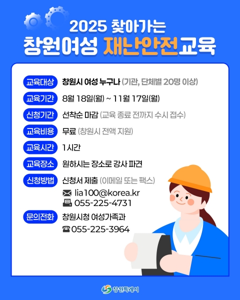 이수경 여성가족과장은 “여성친화도시 창원의 핵심은 안전”이라며 “찾아가는 재난안전교육을 통해 여성뿐만 아니라 지역사회 전반의 안전 역량을 함께 높여 나가겠다”고 말했다.