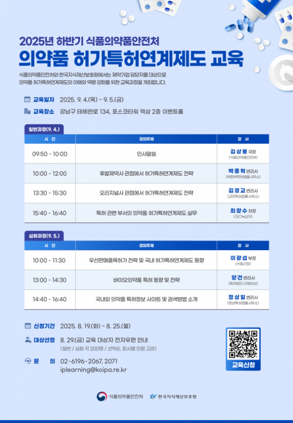 [아시아월드뉴스] 식품의약품안전처는 의약품 허가특허연계제도 관련 제약업계 실무자 등을 대상으로 9월 4일부터 5일까지 2일간 포스코타워 역삼에서 ‘2025년 하반기 의약품 허가특허연계제도 교육’을 실시한다.