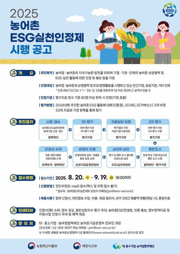 [아시아월드뉴스] 해양수산부, 농림축산식품부, 대·중소기업·농어업협력재단은 농어촌 환경·사회·거버넌스 활동에 기여한 우수 기업·기관을 인정하고 홍보하기 위한 ‘2025년 농어촌 ESG 실천인정제’를 시행한다고 밝혔다.