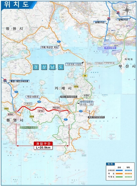 이번 사업은 통영 용남면에서 거제 상문동을 연결하는 총연장 20.9km의 고속도로 건설로 총사업비 약 1조 5천억원이 투입된다.