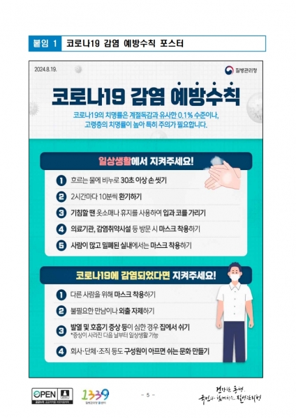 아울러 고위험군이 많이 이용하는 의료기관, 요양병원, 장기요양기관 등 감염취약시설에는 종사자, 보호자, 방문자들이 마스크를 착용할 수 있도록 안내하고 실내 공기를 주기적으로 환기하는 등 코로나 19 감염 예방수칙을 강화해 달라고 전했다.