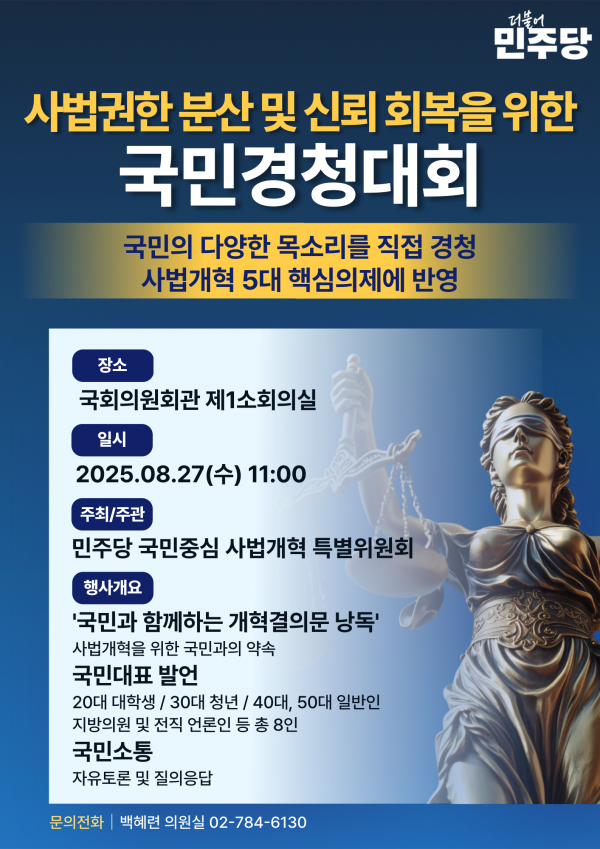 [아시아월드뉴스] 더불어민주당 국민중심 사법개혁 특별위원회는 오는 27일 국회의원회관 제1소회의실에서 ‘사법권한 분산 및 신뢰 회복을 위한 국민경청대회’를 개최한다.