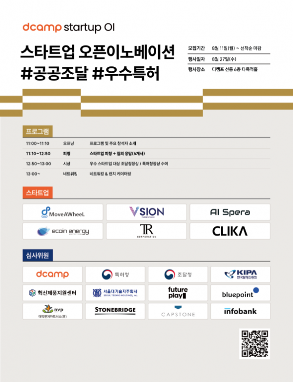이번 프로그램은 조달청·특허청·디캠프 세 기관이 협업해 ‘우수 특허를 가진 스타트업의 공공조달 시장을 통한 성장 지원’ 이라는 테마로 개최됐다.