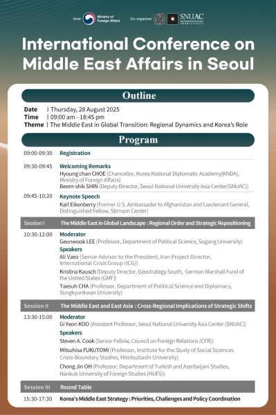 [아시아월드뉴스] 외교부는 8.28. 서울대학교 아시아연구소와의 공동 주관 하 ‘서울 중동문제 국제회의’를 개최했다.