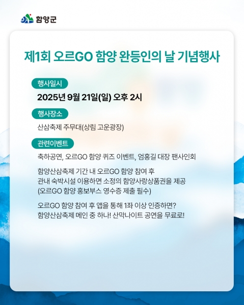 [아시아월드뉴스] 함양군은 오는 9월 21일 오후 2시, 상림공원 고운광장에서 ‘제1회 오르GO 함양 완등인의 날’ 기념행사를 개최한다고 밝혔다.