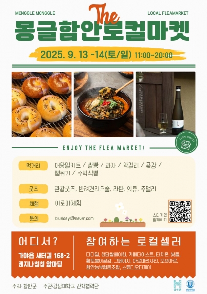 군 관계자는 “지역 대표 맛집 공간을 활용해 먹거리, 볼거리, 살거리가 한자리에 모이는 특별한 행사가 될 것”이라며 “몽글함안 로컬마켓이 군민과 방문객 모두가 즐겁게 참여하는 지역 축제로 자리잡길 기대한다”고 말했다.