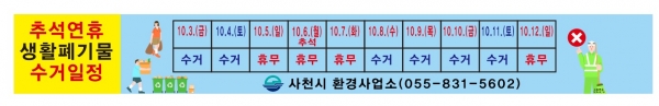 [아시아월드뉴스] 사천시는 추석 명절을 맞아 9월 8일부터 10월 12일까지 ‘2025년 추석 폐기물 관리대책’을 수립·추진해 명절 쓰레기 대란을 사전에 막는다고 10일 밝혔다.