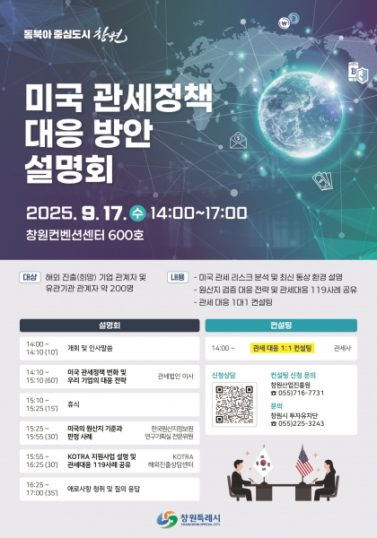 [아시아월드뉴스] 창원특례시는 오는 17일 오후 2시 수출 중소기업을 대상으로 ‘미국 관세정책 대응 방안 설명회’를 개최한다고 밝혔다.