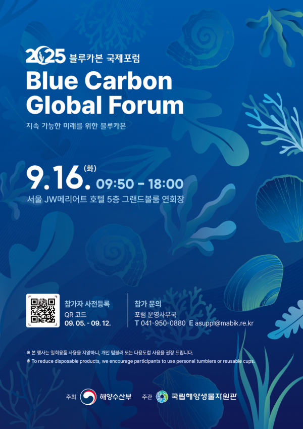 [아시아월드뉴스] 해양수산부는 오는 9월 16일 서울 JW메리어트 호텔에서 국립해양생물자원관과 함께 ‘2025 블루카본 국제포럼'을 개최한다고 밝혔다.