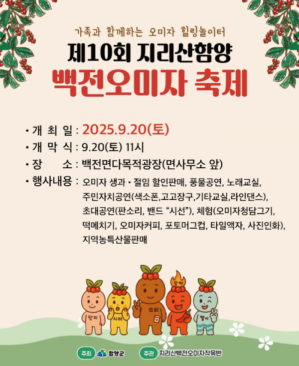 [아시아월드뉴스] 함양군 백전면에서 지역 대표 특산물인 오미자를 주제로 한 ‘제10회 지리산함양 백전오미자축제’ 가 오는 9월 20일 백전면 다목적광장에서 개최된다.