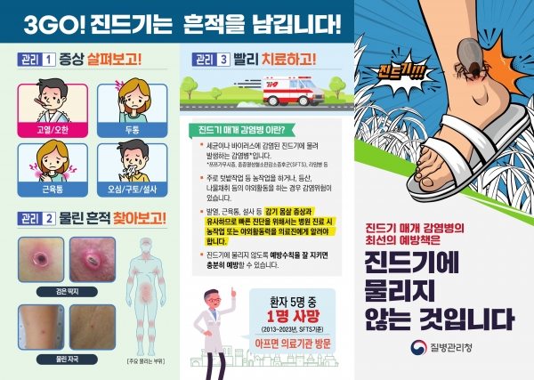 조호경 보건정책과장은 “진드기매개감염병 예방을 위한 최선의 방법은 진드기에 물리지 않는 것으로 예방수칙 준수가 가장 중요하다”며 “제초활동, 농작업 등 야외활동 후 2주 이내 발열·구토·설사 등의 증상이 나타나면 즉시 의료기관을 방문해 진료를 받아야 한다”고 말했다.