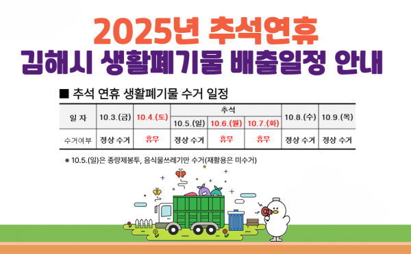 [아시아월드뉴스] 김해시는 다가오는 추석 연휴 기간 시민과 귀성객이 쾌적한 환경에서 명절을 보낼 수 있도록 생활폐기물 처리 대책을 시행한다고 30일 밝혔다.