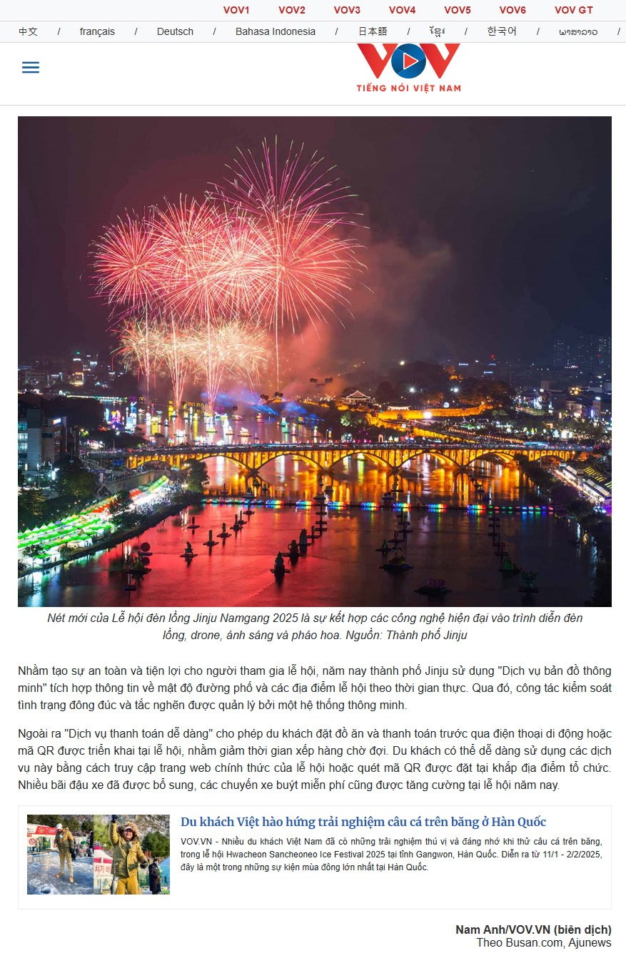 VOV는 “진주남강유등축제가 ‘역사의 강, 평화를 담다’를 주제로 열리며 7만 개 이상의 유등이 남강과 진주성을 밝히고 있다”며, “임진왜란 당시 유등이 통신과 신호의 수단으로 사용된 역사적 의미를 오늘날 평화와 화합, 희망의 상징으로 발전시켰다”고 소개했다. 또한, 조규일 진주시장이 “유등이 진주를 세계적인 축제로 이끄는 핵심 요소”라고 강조한 발언도 함께 전했다.