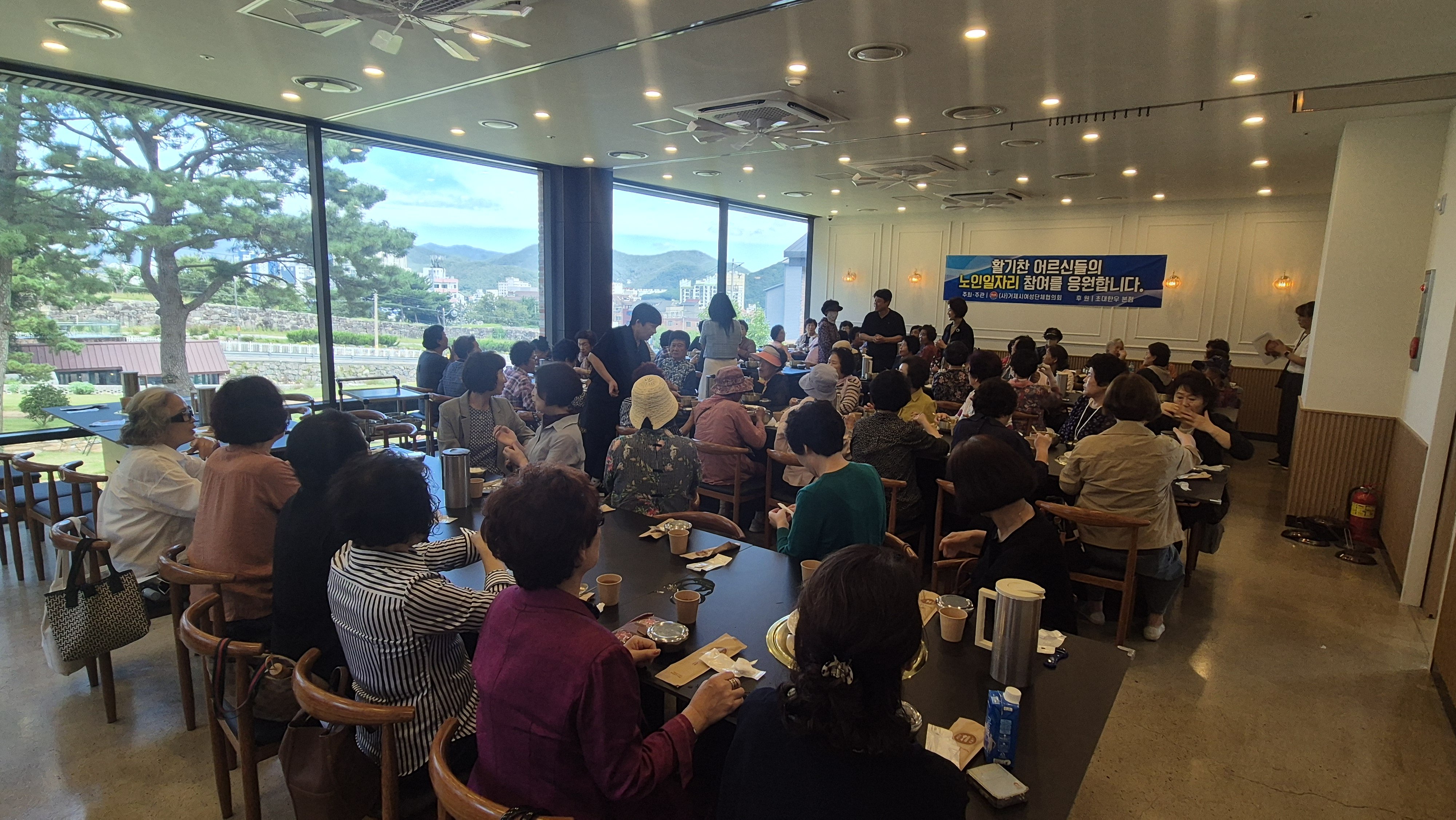 [아시아월드뉴스] 거제시 여성인력개발센터(센터장 박재자)는 지난 무더운 여름 동안 노인사회활동지원사업에 참여한 어르신들을 격려하기 위해 지역 음식점 ‘초대한우 본점’과 함께 점심식사 나눔 행사를 마련했다. 이번 행사는 초대한우 본점 대표의 뜻있는 제안으로 성사됐다.