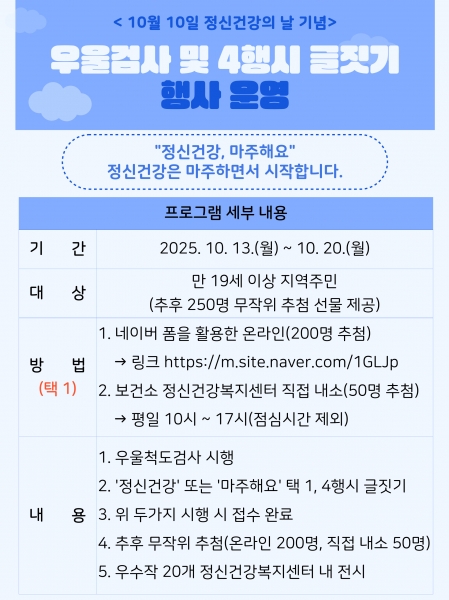 이번 행사는 만 19세 이상 지역 주민을 대상으로 진행되며 우울감 조기 발견과 긍정적인 정신건강 메시지 확산을 위해 기획됐다.