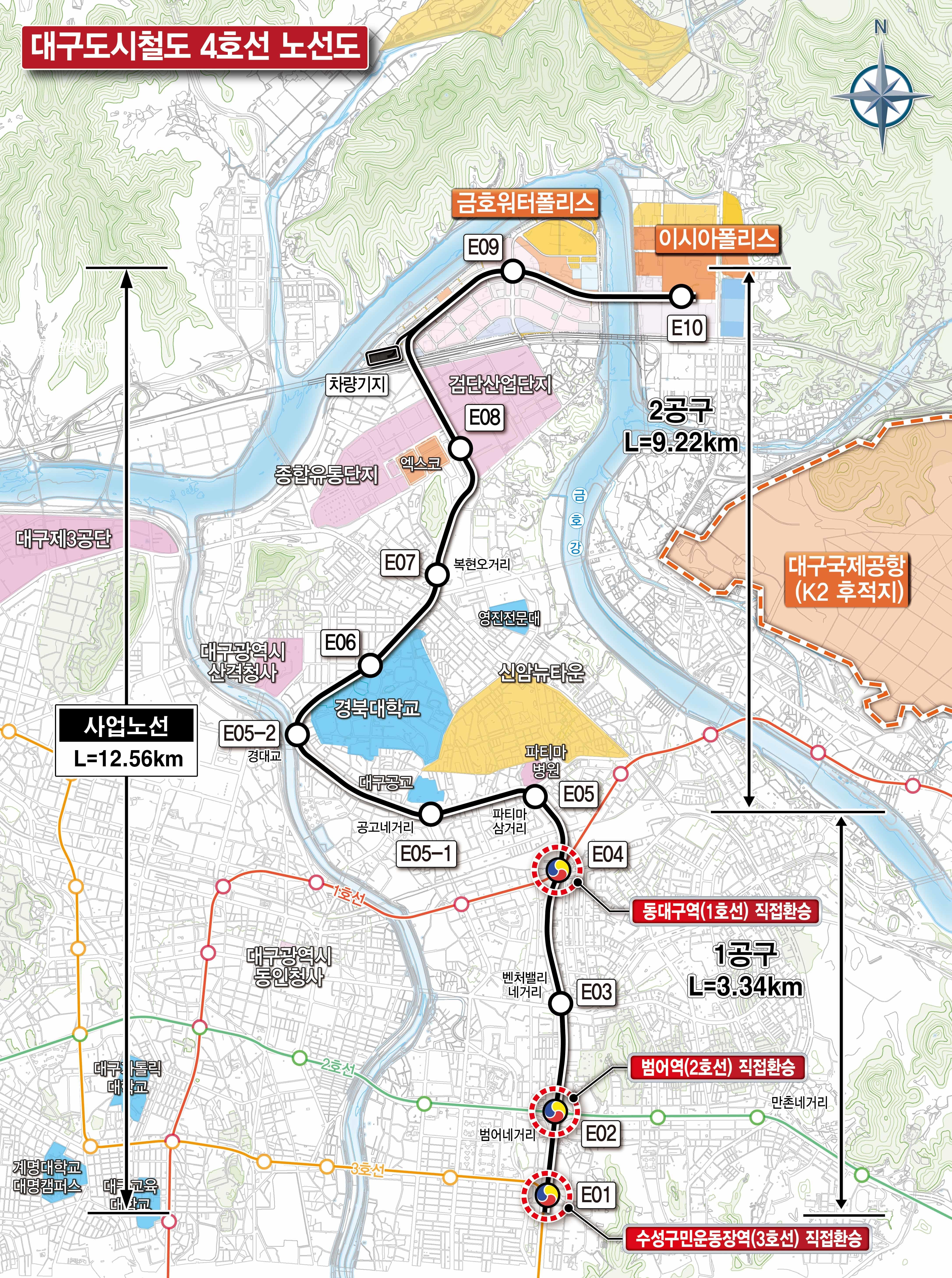 사업개요는 수성구민운동장역~동대구역~경북대~엑스코~이시아폴리스 구간에 걸쳐 진행된다.