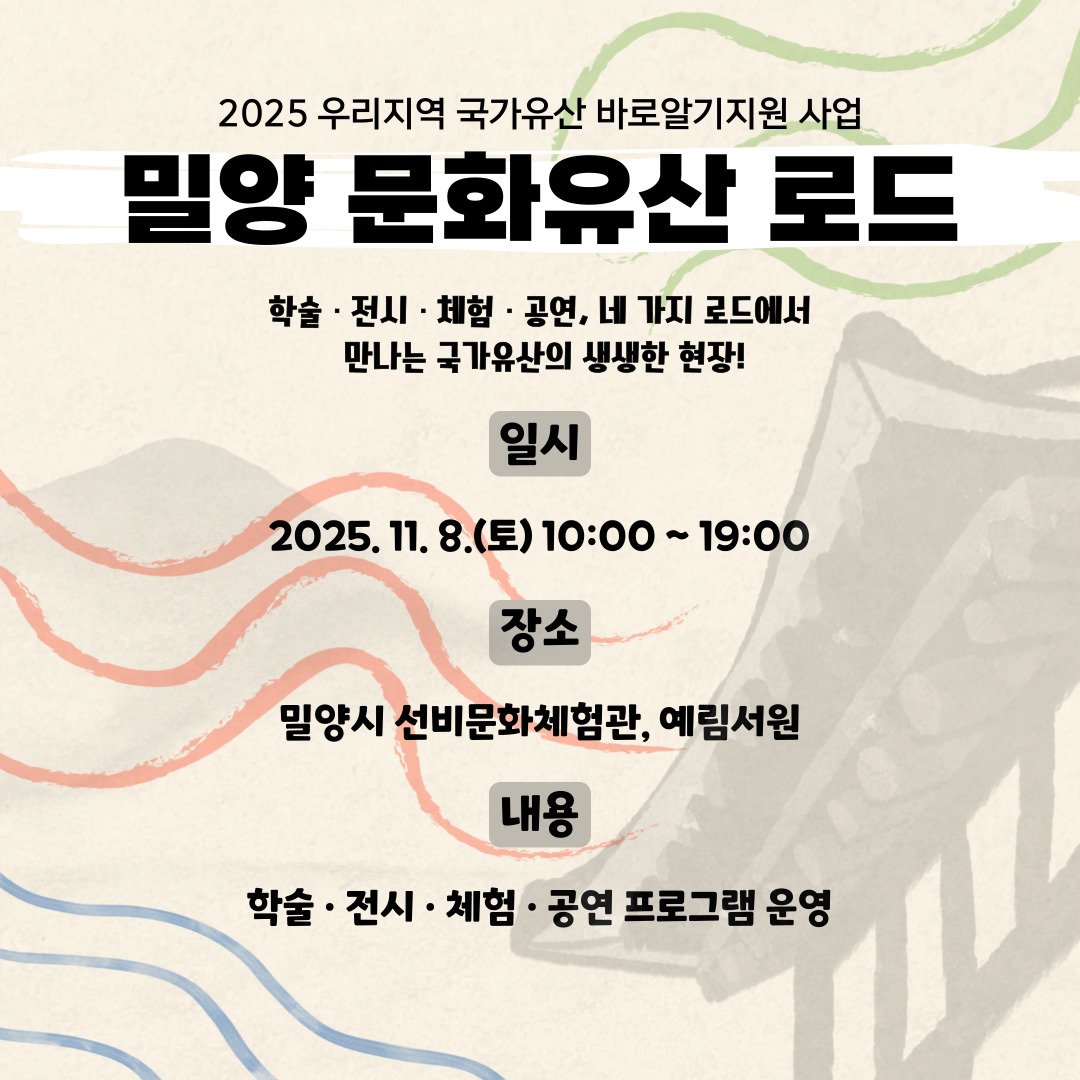 [아시아월드뉴스] 밀양문화관광재단(이사장 안병구, 이하 재단)은 오는 11월 8일 오전 10시부터 오후 7시까지 예림서원과 선비문화체험관 일원에서 지역 무형유산의 가치를 시민과 함께 나누는 ‘밀양 문화유산 로드’를 개최한다고 13일 밝혔다.