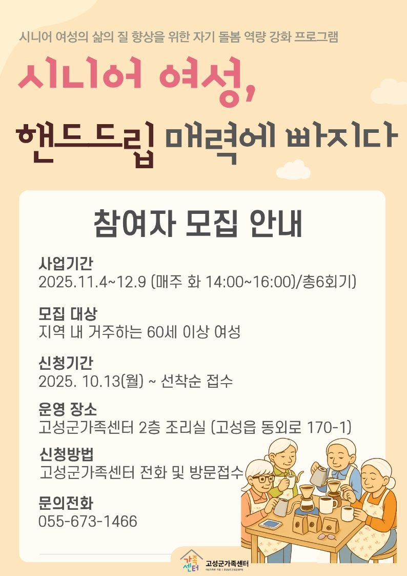 [아시아월드뉴스] 고성군가족센터(센터장 황순옥)는 지역 내 60세 이상 시니어 여성의 자기 돌봄 역량 강화 프로그램 ‘시니어 여성, 핸드드립 매력에 빠지다’의 참여자를 모집한다.