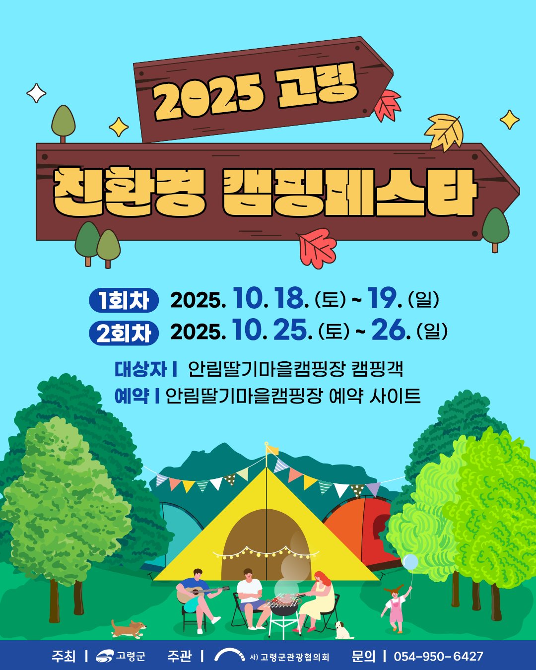 [아시아월드뉴스] 지역과 미래를 배려하는 친환경 캠핑 문화 확산을 위해 마련된 ‘2025 고령 캠핑 페스타’ 가 오는 10월 18일(토)부터 19일(일), 10월 25일(토)부터 26일(일) 두 차례에 걸쳐 안림딸기마을캠핑장에서 열린다.