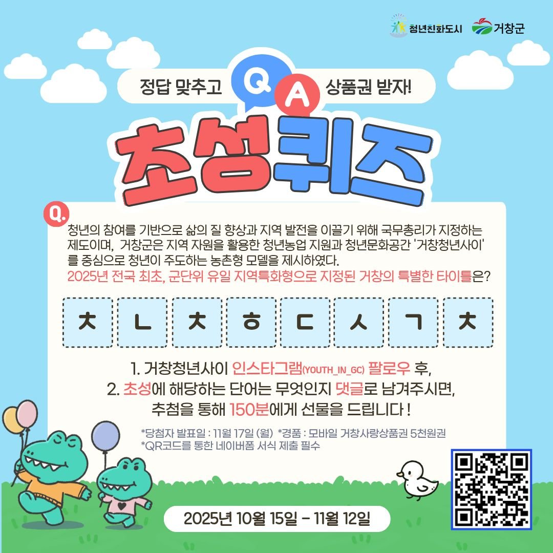 우선 거창군 청년정책 공식 인스타그램 계정(@Youth_in_gc)을 팔로우한 뒤, 이벤트 기간 중 게시되는 초성 퀴즈 게시물에 정답 댓글을 남기고 게시물 내 안내된 네이버폼 링크를 통해 이름과 연락처 등 인적 사항을 제출하면 된다.