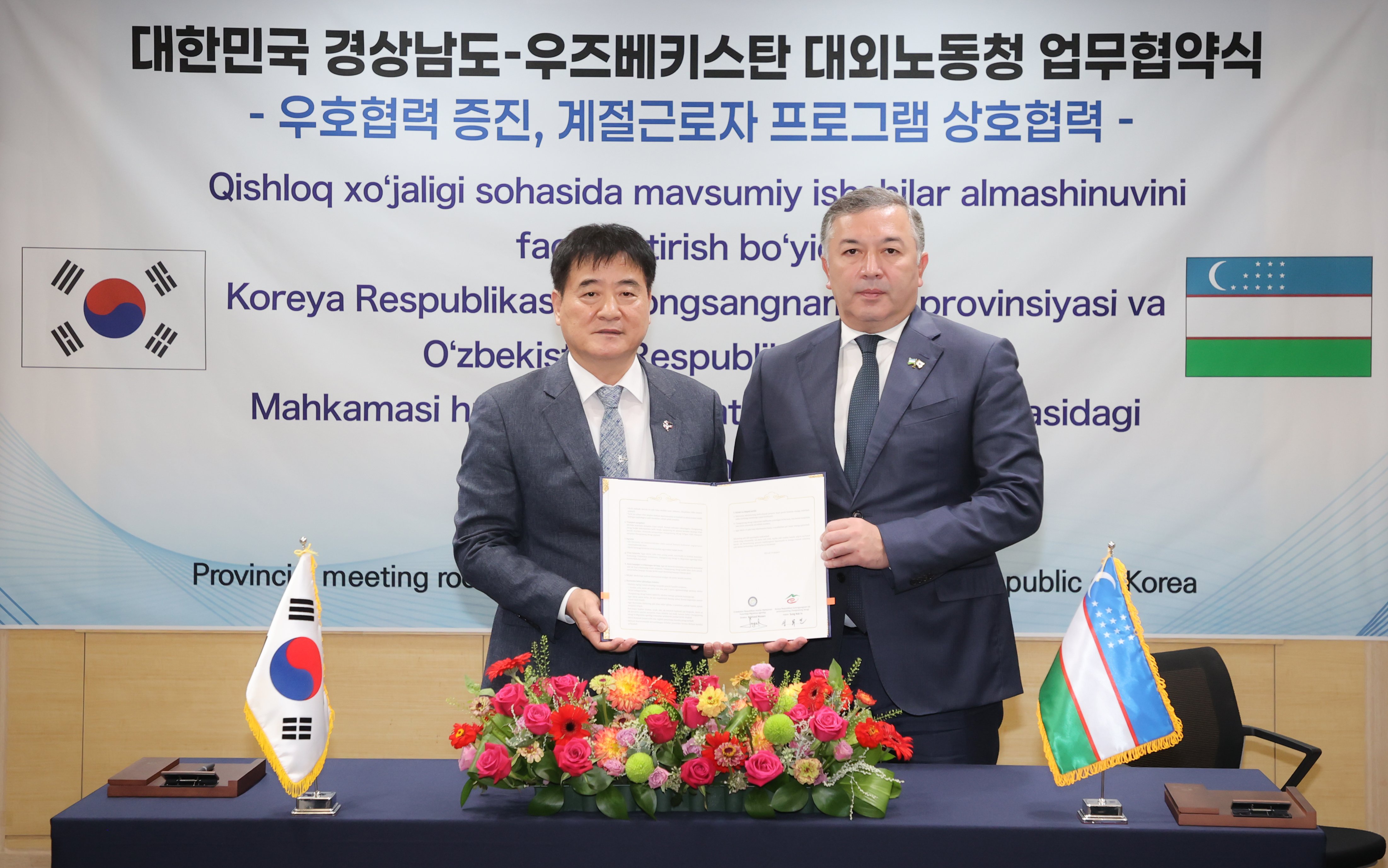 [아시아월드뉴스] 창녕군(군수 성낙인)은 지난 14일 경상남도 도청 도정회의실에서 열린 ‘우즈베키스탄-시군 합동 외국인 계절근로자 업무협약(MOU) 체결식’에 참석해 우즈베키스탄 대외노동청과 외국인 계절근로자 인력 수급을 위한 협력 양해각서(MOU)를 체결했다.