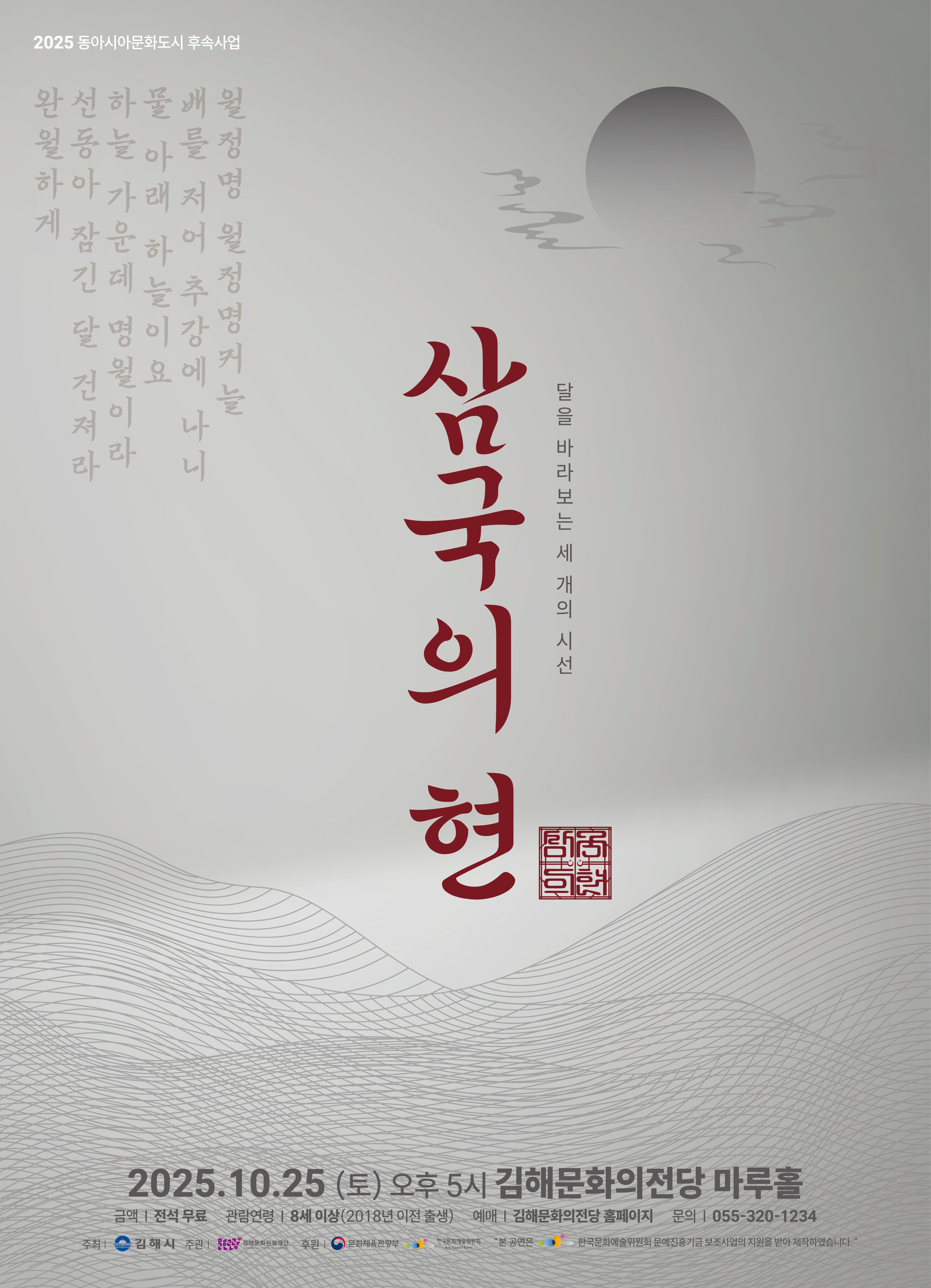 [아시아월드뉴스] (재)김해문화관광재단(대표이사 최석철) 김해문화의전당은 2025 동아시아문화도시 후속 사업 특별공연 ‘삼국의 현() – 달을 바라보는 세 개의 시선’을 오는 25일(토) 오후 5시 김해문화의전당 마루홀에서 선보인다.