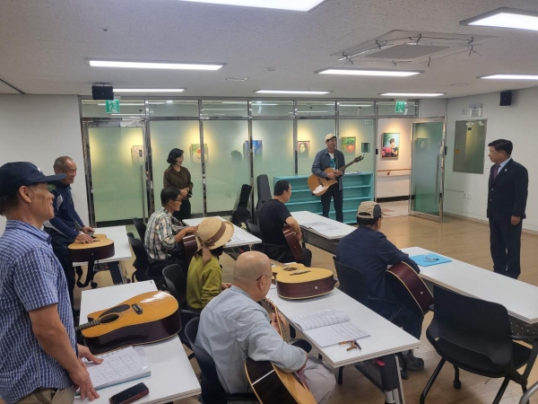 [아시아월드뉴스] 고성군이 운영하는 고성군종합사회복지관 분관에서는 10월 17일 저녁, 야간노래교실과 통기타반 수강생들을 격려하기 위해 이상근 군수가 직접 현장을 방문했다.