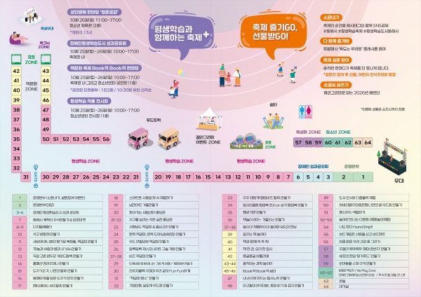 세대와 계층을 잇는 소통의 공간 조성을 위해 지역의 100여개 평생학습관련 기관·단체·동아리, 학습자 등이 참여해 평생학습마당·BOOK적BOOK적한마당·장애인 평생학습한마당·문해교육 한마당 등 테마별로 나누어 공연발표, 체험·홍보존 및 전시존을 운영하며 어린이를 위한 뮤지컬, 마술극 등 다양한 프로그램도 진행된다.