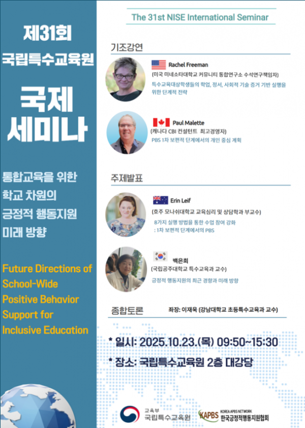 [아시아월드뉴스] 국립특수교육원은 한국긍정적행동지원협회와 공동으로 10월 23일 ‘통합교육을 위한 학교 차원의 긍정적 행동지원 미래 방향’을 주제로 ‘제31회 국제세미나’를 개최한다.