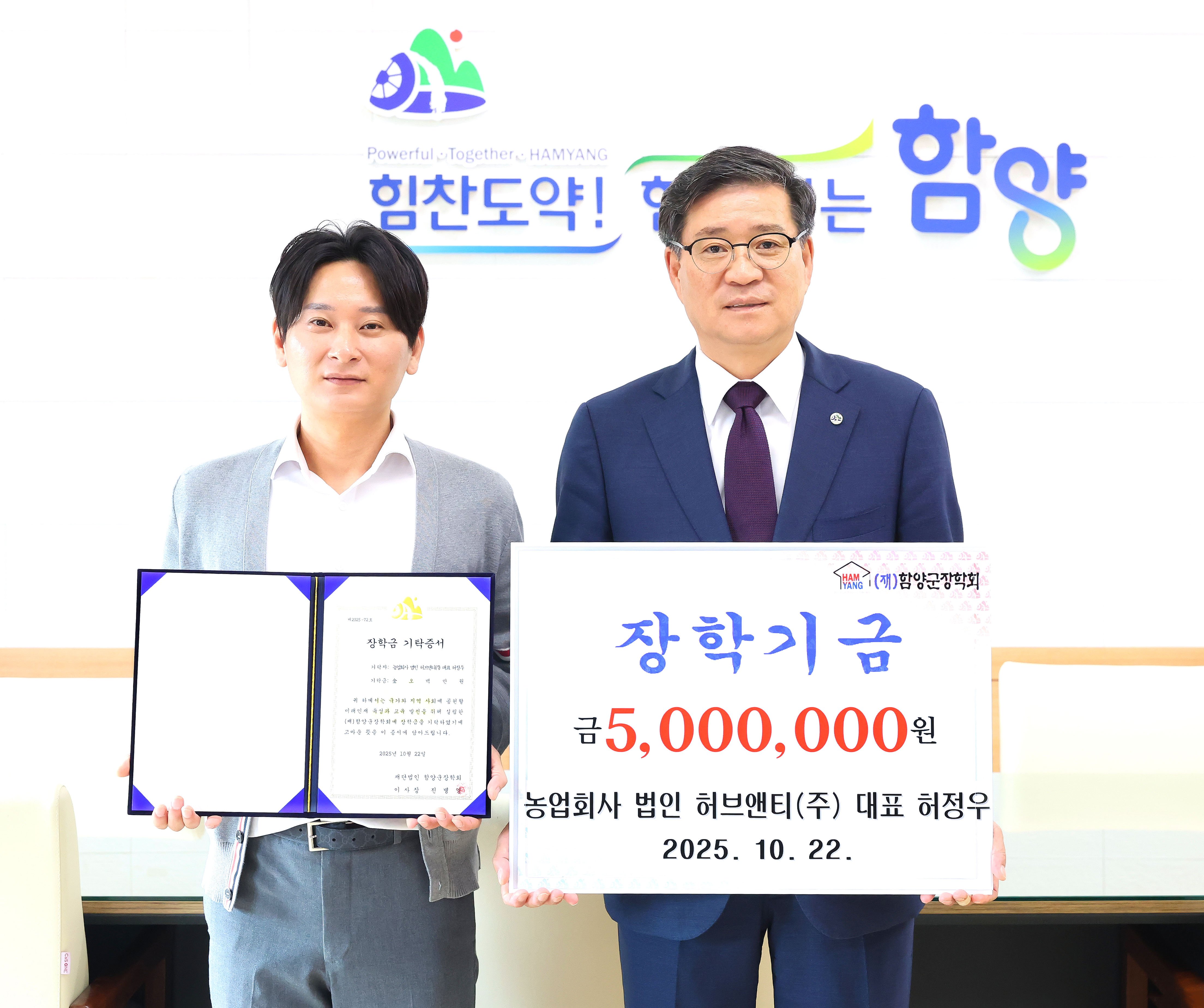 (재)함양군장학회는 10월 22일 대한전문건설협회 경남도회 함양군위원회(위원장 강인익)와 농업회사 법인 허브앤티(주) 허정우 대표가 각각 500만원의 장학금을 기탁했다고 밝혔다.