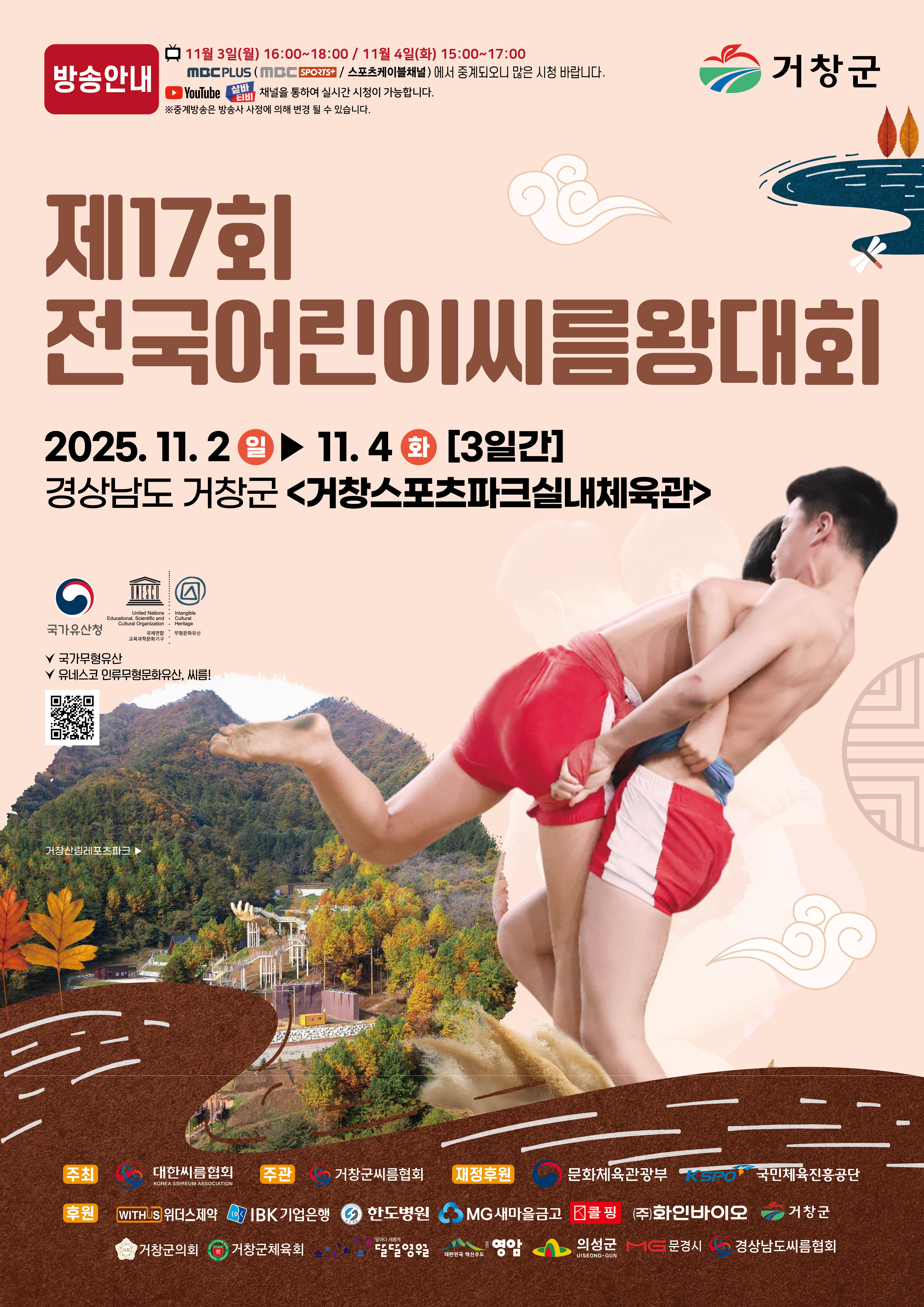 [아시아월드뉴스] 거창군은 대한씨름협회(회장 이준희)가 주최하고 거창군씨름협회(회장 박진영)가 주관하는 ‘대통령배 2025 전국씨름왕선발대회’와 ‘제17회 전국어린이씨름왕대회’를 오는 29일부터 11월 4일까지 7일간 거창스포츠파크 실내체육관에서 개최한다고 밝혔다.