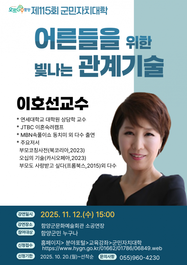 [아시아월드뉴스] 함양군은 오는 11월 12일 오후 3시, 함양문화예술회관 소공연장에서 ‘제115회 함양군민자치대학’을 개최한다.