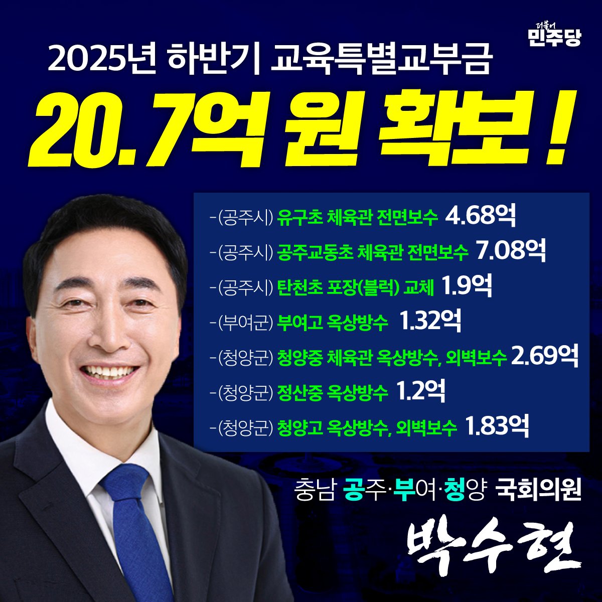 [아시아월드뉴스] 박수현 국회의원(더불어민주당·공주·부여·청양)이 교육부 '지역 교육현안 특별교부금'총 20억 7천만원을 확보했다.