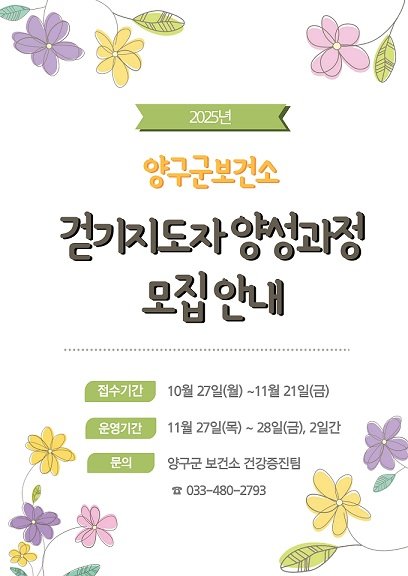 [아시아월드뉴스] 양구군은 군민의 건강생활 실천 역량을 강화하고 올바른 걷기문화를 확산하기 위해 ‘2025년 걷기지도자 양성과정’참가자를 모집한다.