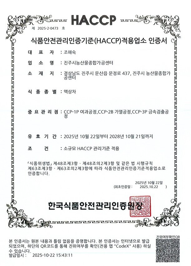 진주시 농산물종합가공센터는 지역농산물을 활용해 가공제품 개발과 농업인의 소득창출을 돕고 있으며 지난해 7월 과채주스류와 캔디류 2개 유형에 대해 ‘HACCP’인증을 받은 후, 올해 10월 22일 잼류와 액상차 2개 유형을 추가로 인증받아 농산물종합가공센터에서 생산되는 제품의 안전성과 신뢰도를 한층 더 높였다.