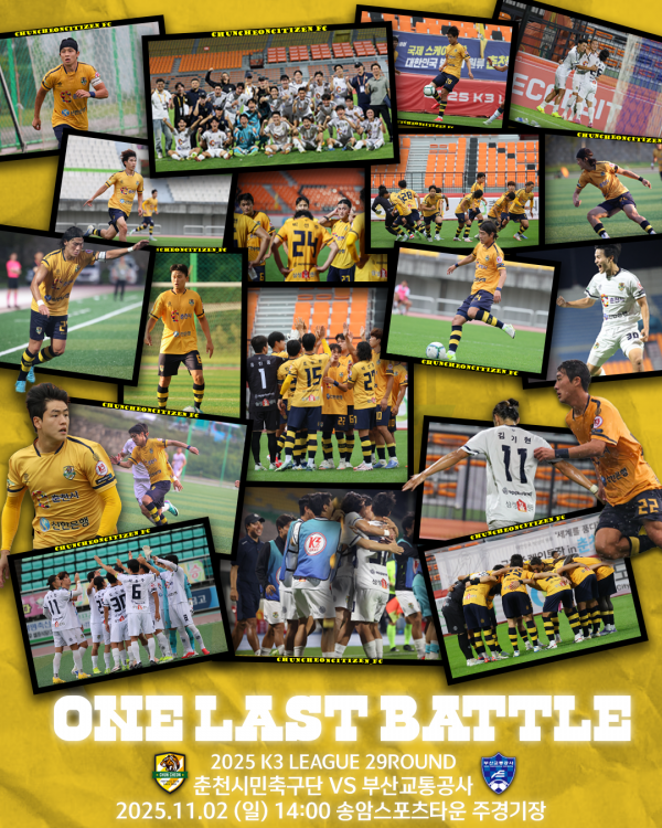[아시아월드뉴스] 춘천시민축구단의 2025 시즌 마지막 홈경기가 오는 11월 2일 오후 2시 송암스포츠타운에서 열린다.