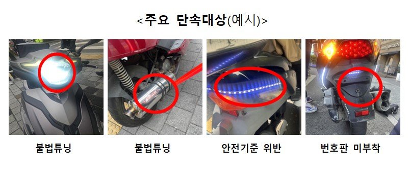 주요 단속 대상은 △전조등 및 소음기 등 불법 튜닝 △안전기준 위반 △미사용 신고 운행 △번호판 미부착·훼손·가림 등 자동차 관리 법령 위반 이륜자동차다.