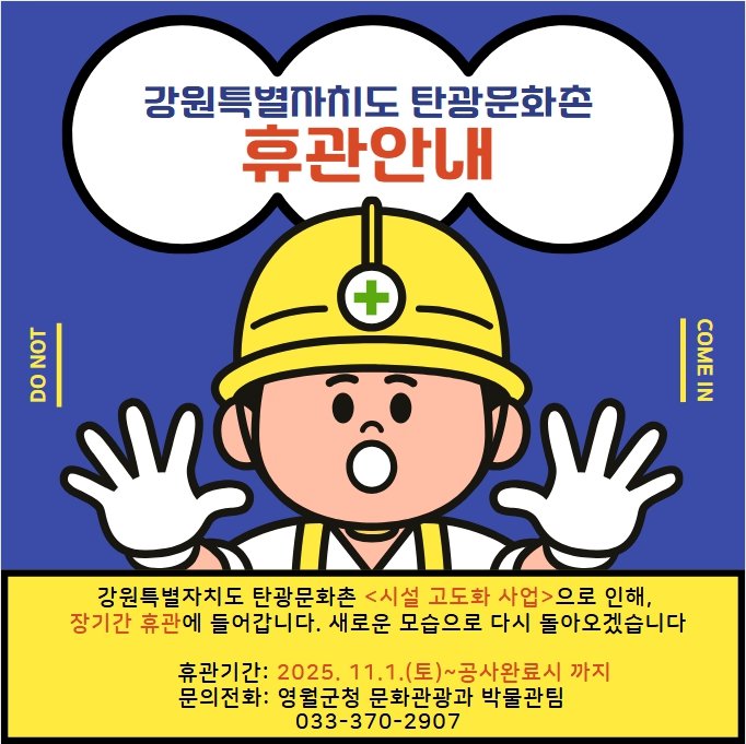 [아시아월드뉴스] 강원특별자치도 탄광문화촌이‘탄광문화촌 고도화 사업’의 일환으로 추진되는 시설 리모델링 공사에 따라 2025년 11월 1일부터 2026년 12월 31일까지 휴관에 들어간다.