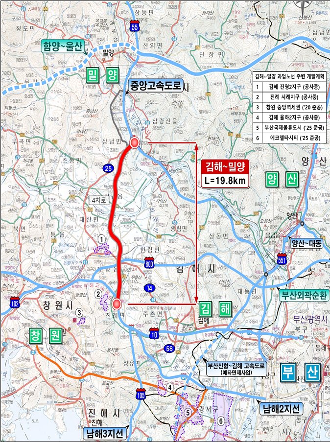 김해~밀양 고속도로 건설사업은 사업비 1조 4,965억원, 총연장 19.8km 규모로 김해시 진례면과 밀양시 상남면을 연결하는 노선이다.