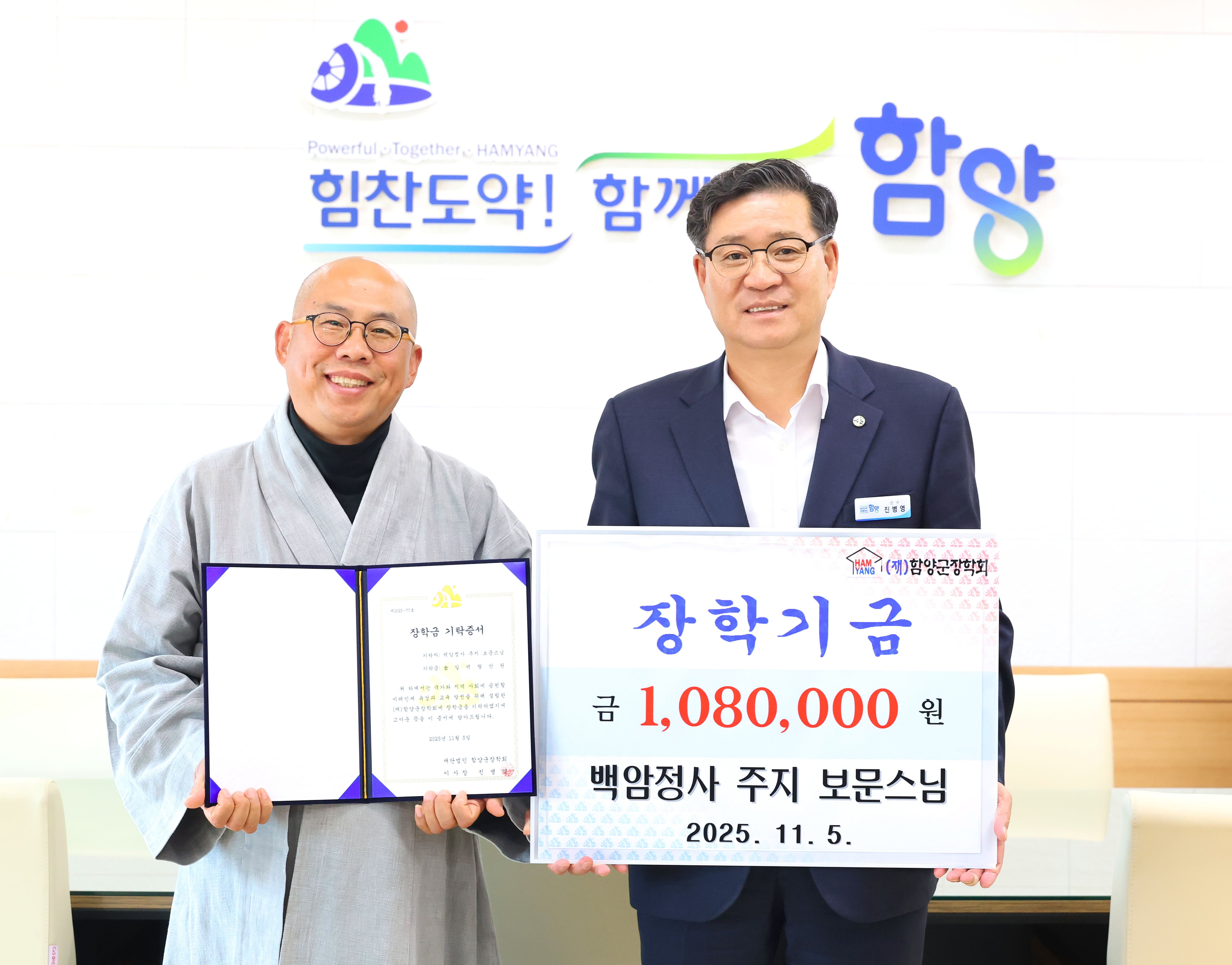 [아시아월드뉴스] 함양군장학회는 11월 5일 백암정사 주지 보문 스님이 지역 인재 육성을 위해 사용해 달라며 장학금 108만원을 기탁했다고 밝혔다.